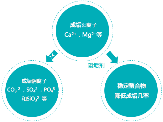 1.螯合作用:中低硬度水中,起重要作用的是阻垢劑的螯合作用
